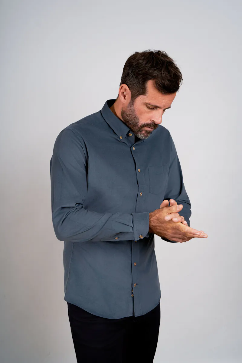 Die Ärmellänge sollte zwei Zentimeter oberhalb der Daumenwurzel enden, wenn Ihr Arm locker am Körper herabhängt. Diese Länge ermöglicht es Ihnen, die Arme frei zu bewegen und ein Sakko zu tragen, ohne dass das Hemd hochrutscht. Wenn Sie eine Krawatte oder einen Blazer tragen, sollte die Manschette des Hemdes etwa einen Zentimeter aus den Ärmeln des Oberbekleidungsstücks hervorschauen. Ein zu kurzer Ärmel entblößt das Handgelenk, während ein zu langer Ärmel einen nachlässigen Eindruck erweckt.