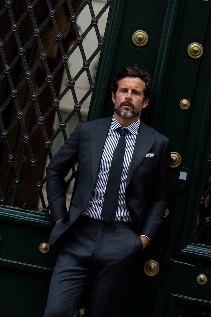 Benoît trägt ein bügelleichtes Twill-Hemd, das nach seinem Passform-Schlüssel geschnitten ist 87BX6