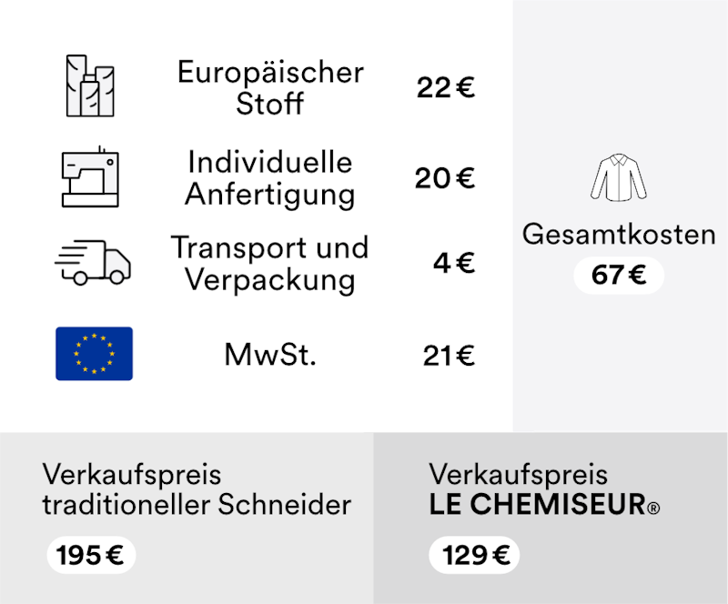 Ihre Treue und die wachsende Zahl an Kunden ermöglichen es uns, unsere Margen zu senken und Ihnen wirklich hochwertige, maßgeschneiderte Hemden aus europäischen Stoffen zu einem unschlagbaren Preis-Leistungs-Verhältnis anzubieten.