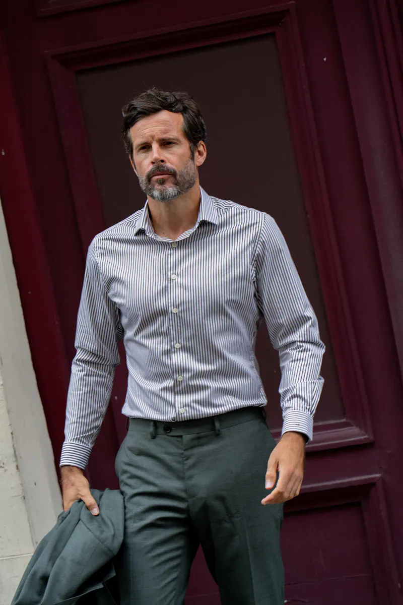 The cutaway collar isn't widely available on the French market, yet it's an original collar to have in your wardrobe. We're used to small, thin collars, but the cutaway offers a number of aesthetic and practical advantages. In fact, this is the first thing you notice when you wear it: the collar is what really "makes" the shirt. The cutaway collar is very open, almost cutaway, hence its name. It's characterized by a fairly high distance between the collar points and the angle, which point outwards rather than downwards. The very open angle makes it more elegant than a standard collar. The cutaway collar, with its backward turn, sits perfectly under the jacket, even when you're on the move. As well as adding a touch of originality, it proportions elongated faces and slim necks well, giving them a rounded look, just like French collar shirts.
