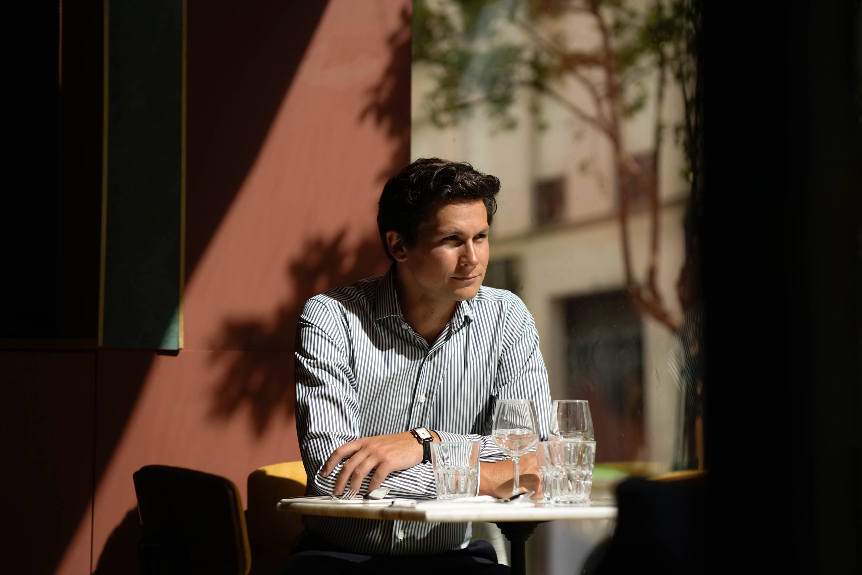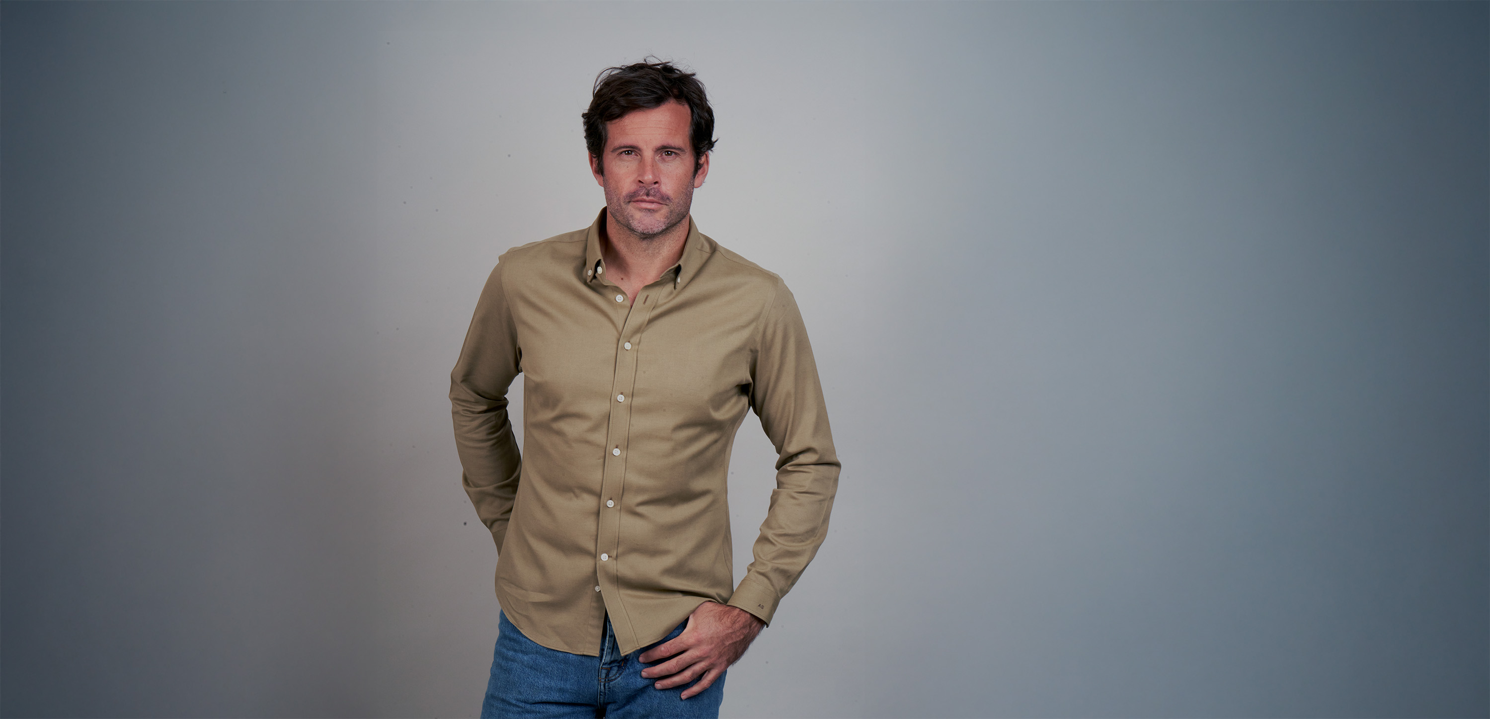 Benoît porte une chemise en twill facile à repasser taillée selon sa Clé de Coupe 87BX6