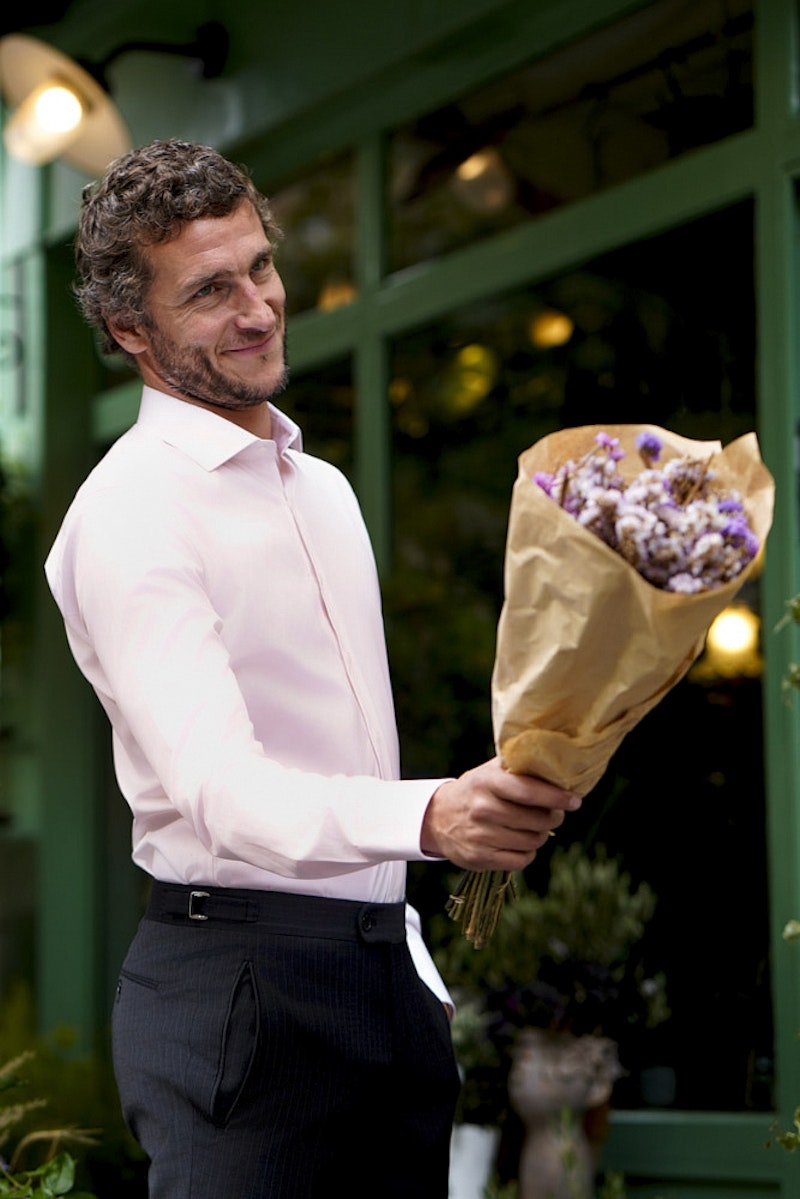 Les chemises unies classiques sont un choix sûr pour un look élégant et intemporel. Une chemise bleue offre un contraste plus doux, modulable selon la teinte de bleu et du gris du costume. Le bleu clair s’harmonise bien avec les costumes gris clairs à moyens, tandis qu’un bleu plus soutenu convient aux gris foncés. De manière générale, privilégiez une chemise légèrement plus claire que votre costume pour préserver l’élégance et l’équilibre de la tenue. À la fois plus original mais sobre, porter une chemise gris perle avec un costume, d'un gris moyen à anthracite, crée un look monochrome chic.